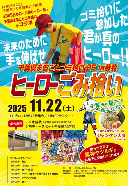 千葉市アリオ蘇我ではその11月22日(土)に日本ローカルヒーロー祭実行委員会主催の今年10周年となる『日本ローカルヒーロー祭』が開催され、子供たちの未来のために開催するこの思いに賛同協力して下さることとなりました。子供たちの夢・ヒーローの協力でアリオ蘇我周辺のゴミ拾いを行い、拾ったゴミの分別を通じて『ゴミの考察』をし、参加者と共に今後の蘇我地域のさらなる美化意識向上のきっかけ作り、青少年健全活動を行います。『ゴミ拾いに参加した君が、正にヒーロー!』拾ったゴミはお菓子と交換します。