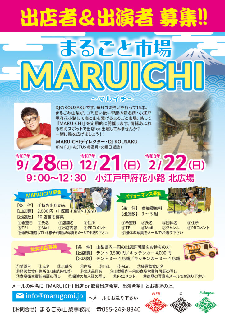 まるごみ山梨はゴミ拾い後のお楽しみと地域の繋がりを深めることを目的に、ゴミ拾い後にを開催しまるごと市場で『MARUICHI』を、山梨県甲府市の新名所・甲府小江戸花小路にて定期的に開催致します。地元の皆様、出店・出演お待ちしております。