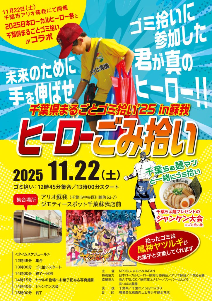 NPO法人まるごみJAPANが目指す日本まるごとゴミ拾い。千葉県は11月23日(日)にBAYFMで朝から『まるごみ特番』を放送しながら、葉県全域を対象とした『千葉県まるごとゴミ拾い』を開催致します。千葉市アリオ蘇我ではその前日の11月22日(土)に日本ローカルヒーロー祭実行委員会主催の今年10周年となる『日本ローカルヒーロー祭』が開催され、子供たちの未来のために開催するこの思いに賛同協力して下さることとなりました。子供たちの夢・ヒーローの協力でアリオ蘇我周辺のゴミ拾いを行い、拾ったゴミの分別を通じて『ゴミの考察』をし、参加者と共に今後の蘇我地域のさらなる美化意識向上のきっかけ作り、青少年健全活動を行います。『ゴミ拾いに参加した君は、正に未来へのヒーロー!』拾ったゴミはお菓子と交換します。