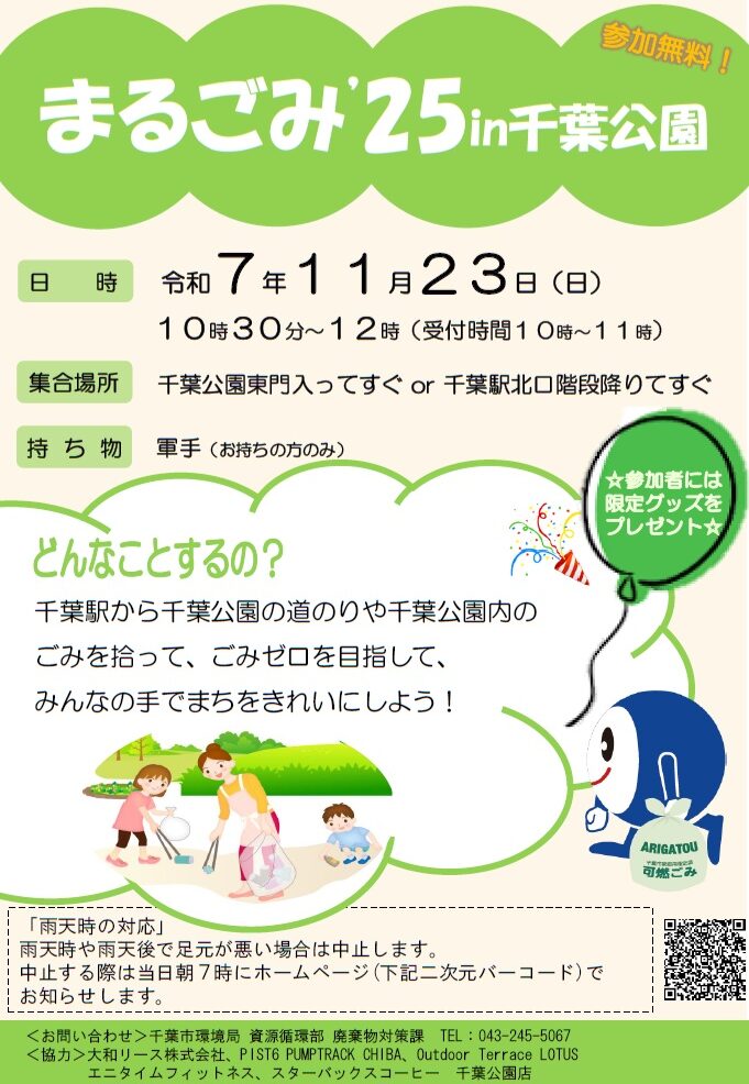 本イベントは、ごみ拾い活動を中心に活動するまるごみJAPANが、毎年11月に開催する「まるごみ(日本まるごとごみ拾い)」の趣旨に千葉市が賛同して実施します。また、11月24日には「ちはなちゃんのお誕生日会」も同じ芝庭エリアで実施します。