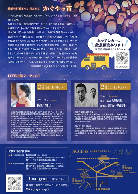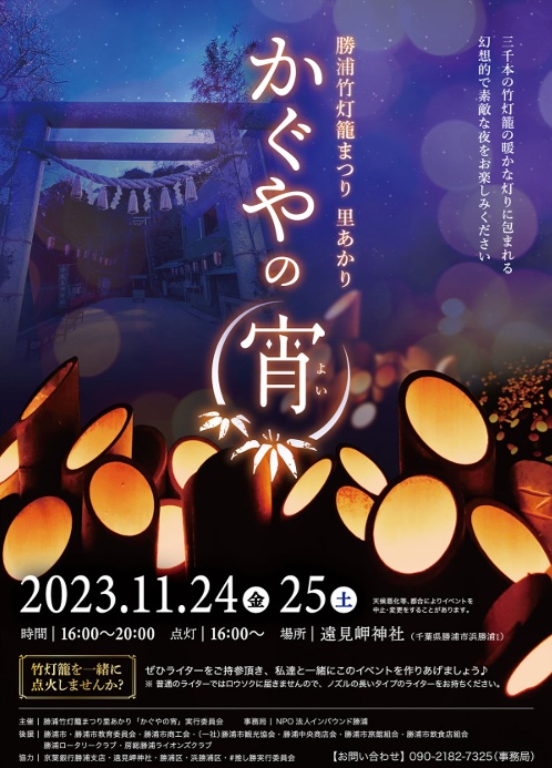 23日は遠見岬神社前に08時45分集合、09時00分スタートで勝浦市内のゴミ拾い、そして竹灯籠の飾り付けを行います。ゴミ拾い参加者には鰹節をプレゼントします。是非ゴミ拾いに参加して、その後は勝浦観光、そして夕方4時からの7000本の竹灯籠で埋め尽くされた幻想的な『かぐやの宵』をお楽しみください