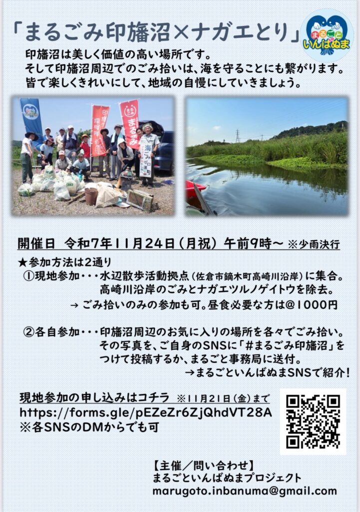 NPO法人まるごみJAPANが主催する「千葉県まるごとゴミ拾い」にまるごといんばぬまプロジェクトが賛同。印旛沼は、千葉県北部の利根川下流南岸に位置する利根川水系の湖沼であり千葉県立印旛手賀自然公園に属します。湖沼水質保全特別措置法に指定され疏水百選に選定されている千葉県にとって大切な愛する湖沼です。まるごといんばぬまプロジェクトは、今回ごみ拾いに合わせてナガエツルノゲイトウの駆除活動も行います。