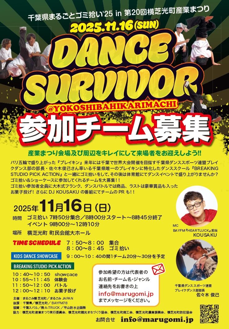産業まつりが開催される会場の役場及び周辺をキレイにして来場者をお迎えするまるごみをお祭り前に実施します。今回は、2024年パリオリンピック正式種目となり俄然盛り上がるBreakin!来年、千葉で世界大会開催を目指す千葉県ダンススポーツ連盟ブレイクダンス部の部長・佐々木俊己さん率いる千葉県唯一のBreakinに特化したダンススクールBREAKING STUDIO PICK ACTIONと一緒にゴミ拾いします。ゴミ拾いの後は体育館にて横芝光町ダンス祭りを開催。一緒にゴミ拾い&ダンスショーケースに参加してくれるチームを大募集します。ダンスバトルでは商品、ラストはお菓子投げをしちゃいます!!