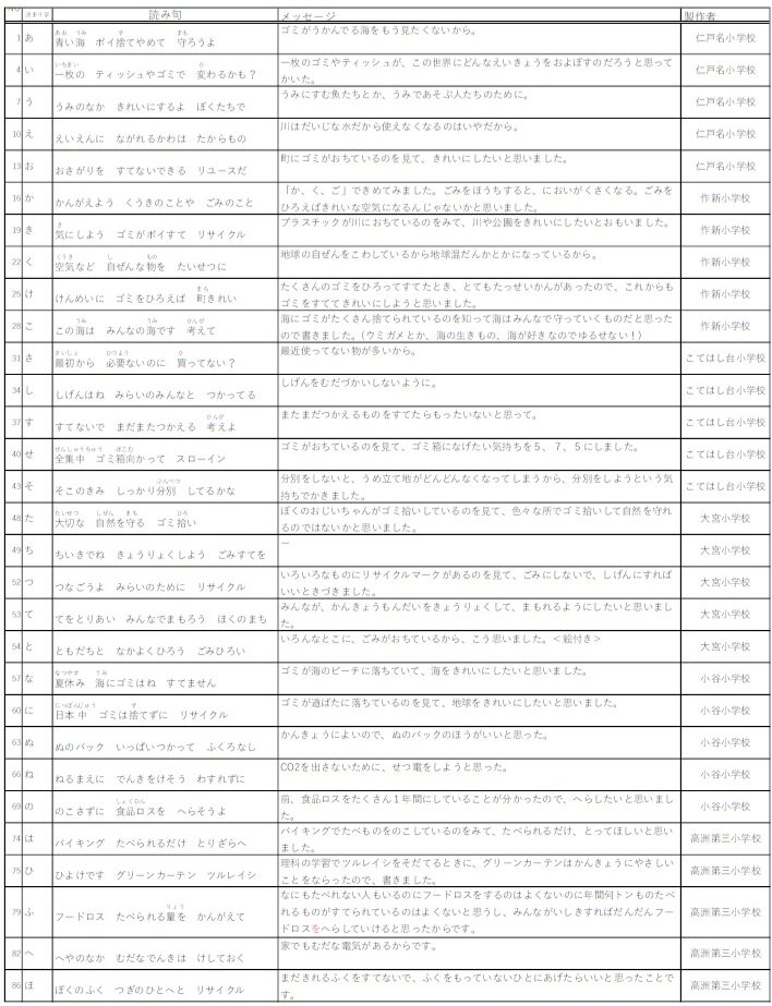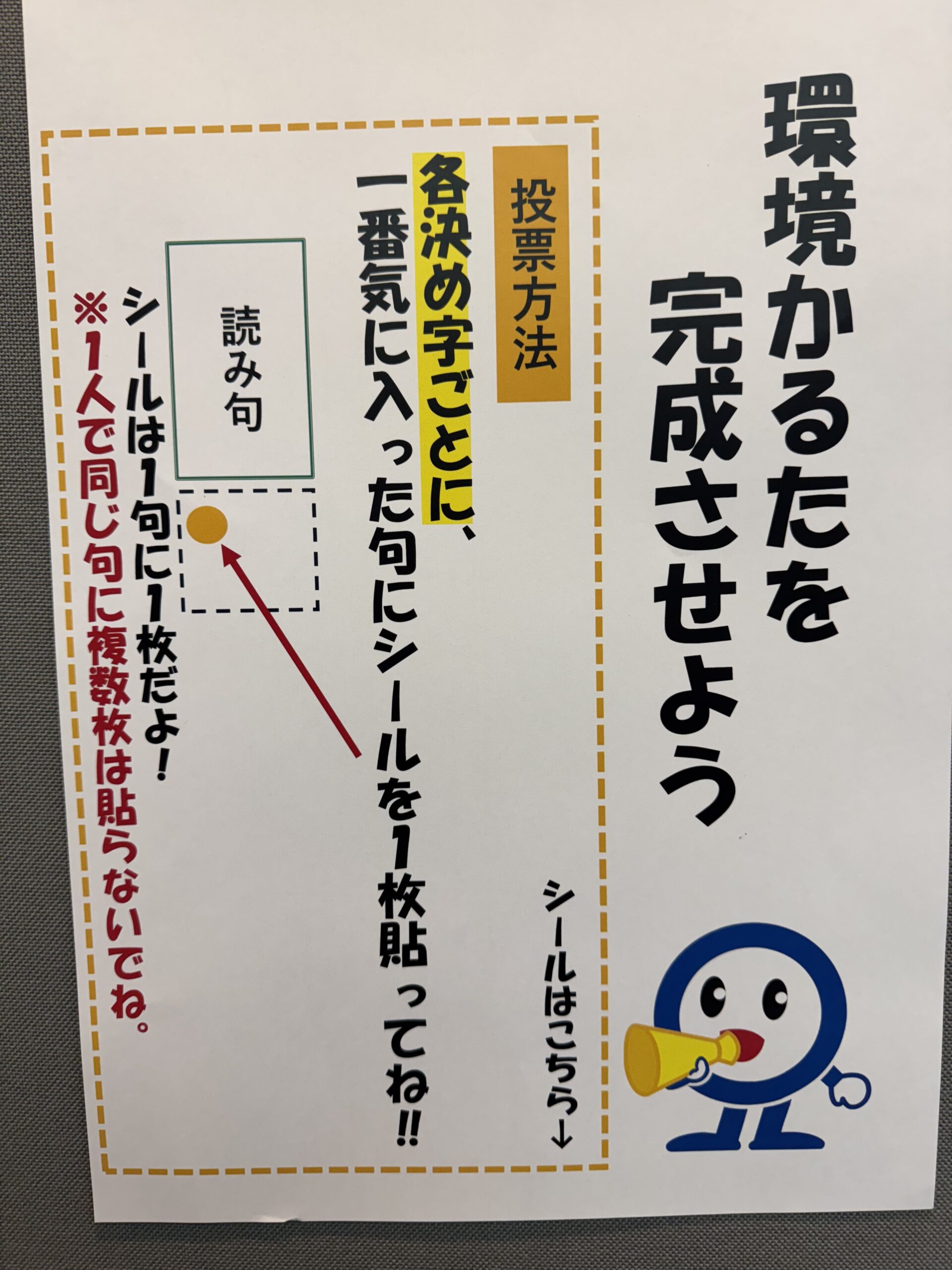 読み句は千葉市・環境局資源循環部廃棄物対策課の協力により、あ~は行までの読み句製作を千葉市内の小学校へ打診。賛同協力を申し出て下さった6校の生徒の作品。ま~ん行までは、BAYFMにて毎週土曜日の朝5時~8時生放送KOUSAKUのHEARTLUCKリスナーや、BAYFMの協力により2025年5月に開催したどきどきフリーマーケット会場にて読み句作品募集ブースを設置し、そこで集まった多くの作品を10月19日に開催された千葉県最大の環境イベントエコメッセ内まるごみ環境カルタ投票所にて最終選考。選ばれた44首。