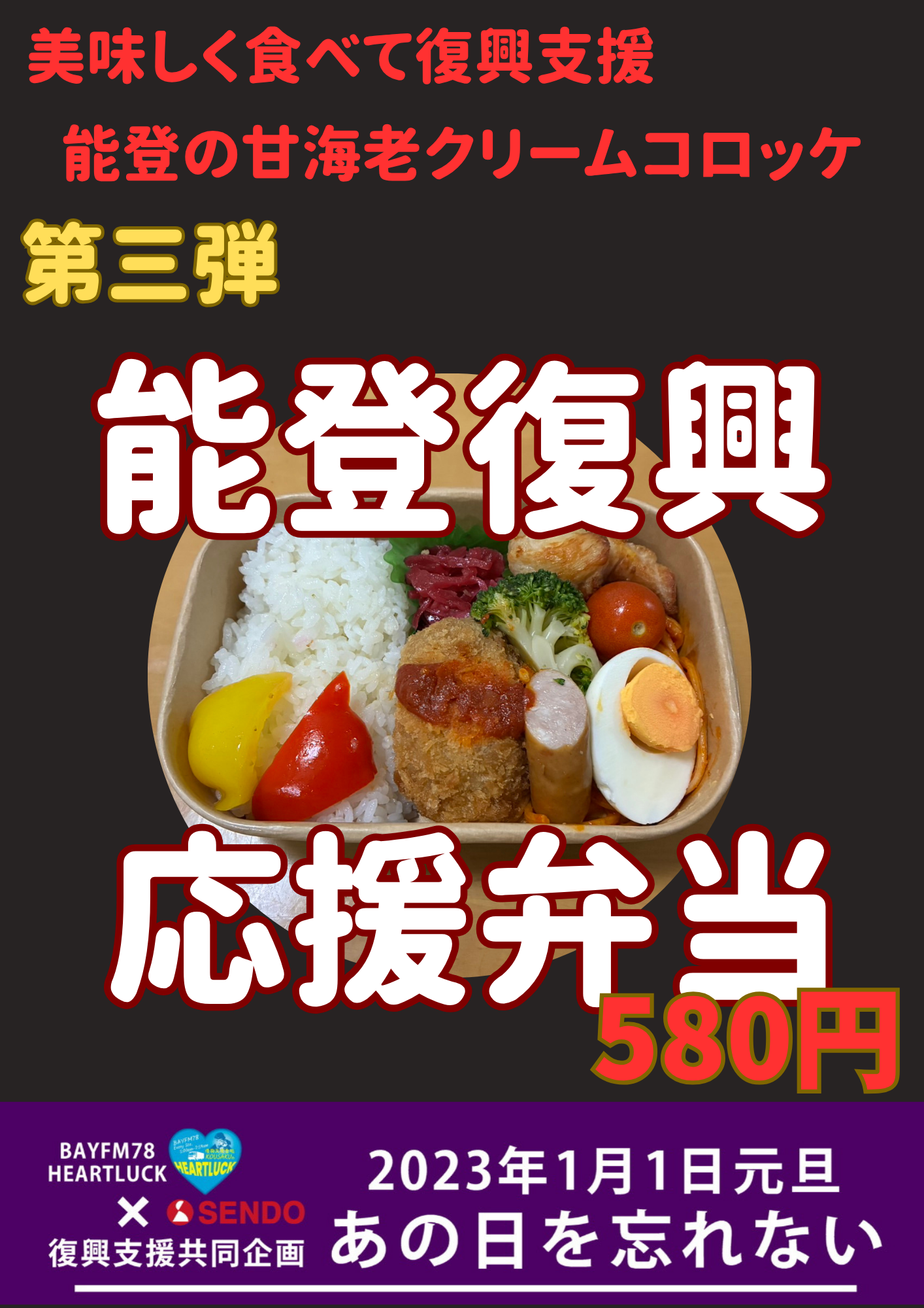 能登の甘海老を使用した『能登甘海老クリームコロッケ』をメインにした第3弾の応援弁当がついに販売開始!! せんどう全店にて開店と同時に販売。限定6,000個の販売です。