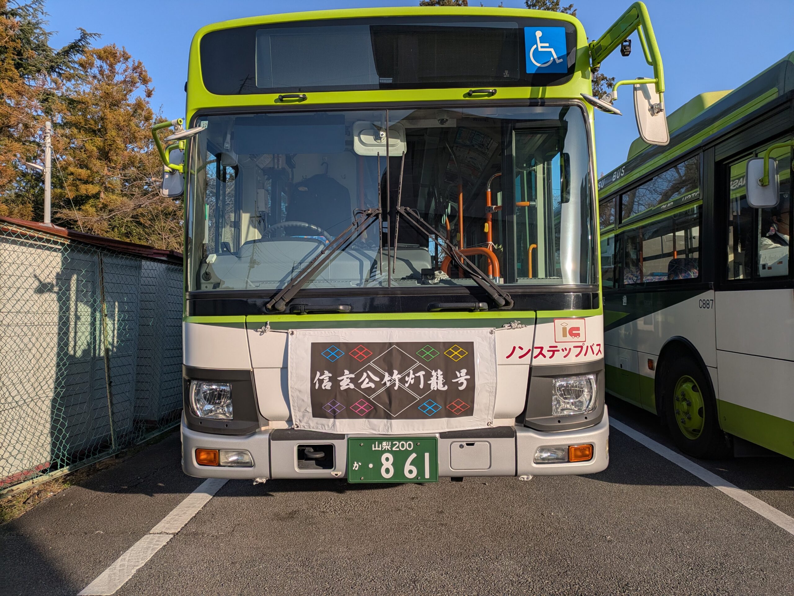 昨年も実施いただきました竹灯籠バスは、車内に竹灯籠を設置し、ご乗車いただいたお客様に『信玄光芸術竹灯籠祭』をPRをしていただくバスです。今年は山梨県立都留興譲館高等学校のご協力により点灯システムを導入。夜に乗車したら優しく光る竹灯籠を観ながら目的地までいけますよ!。竹灯籠バスに当たった方はラッキー! 乗車された方は是非教えてください!!