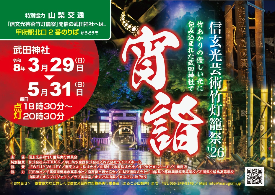 今年も山梨交通のご理解ご協力を賜り、甲府市内のバスにポスターの掲示を行っていただきます。まるごみとして信玄光芸術竹灯籠祭が行われている武田神社には、公共の交通機関でお越しいただくことをお勧めいたします。